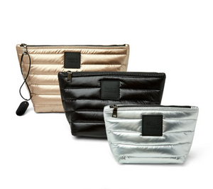 The Travel Trio Organizational Pouches are a triple threat of style, organization, and wow! These three perfectly sized bags keep you organized during everyday adventures to jet-setting around the world. Our signature quilting exterior is lined with silver foil finish providing shape and style to these gems. Perfect for essentials from beauty products to power cords and beyond….even ideal for a chic and sporty clutch on the go