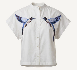 Crafted from 100% GOTS certified organic cotton, the Ariel Blouse is a short sleeve button down designed with thoughtful, feminine details. Featuring a delicate embroidered bird at the front and a soft pleat at the back, it’s finished with an easy, relaxed silhouette for a polished look.
