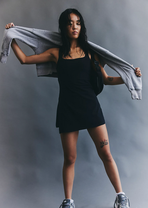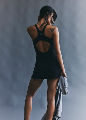 Fit: Fitted; racer-back; low back cutout; built-in shorts are micro-length; dress is shorty-length