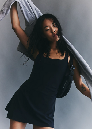 Features: Super-soft, peached fabrication; four-way stretch; breathable and lightweight; bodice is power-mesh lined for added support; built-in micro short with side phone pocket; dress hangs loosely over interior liner; shirring at side body for flattering shape; square-neck; low back cutout; racerback straps