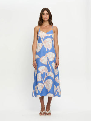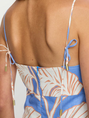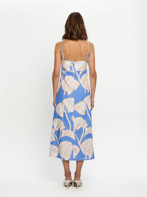 Ilana is oversized ivory and blush leaf motifs on a bold sky-blue base. The Ilana Midi Dress is a relaxed silhouette featuring adjustable thin straps, a softly flared hem and an invisible centre-back zip. Perfect for coastal getaways, long lunches or relaxed summer celebrations.