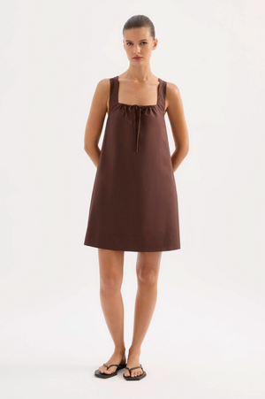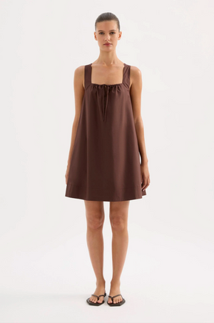The Alexis Mini Dress is made from a cotton poplin which has be washed for a smooth, crisp hand feel. The silhouette is feminine and relaxed with a square, gathered neckline and soft billowing skirt finishing mini in length. Features include tie at front and side seam pockets.