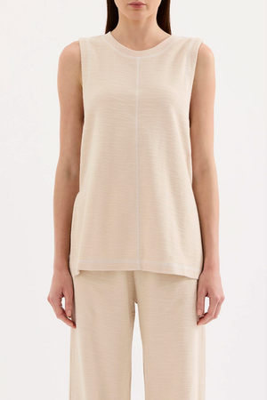 The Sutton Tunic is made from a textured cotton/linen blend fabrication that has a breathable hand feel. This sleeveless tunic has a boxy fit and features a crew neckline, side seam slits and contrast white stitching detail.