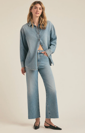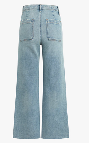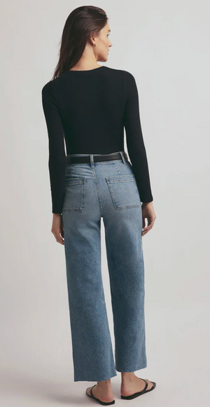 Relax, we've got you. The relaxed wide leg, wide hem Mischa jean has a vintage-blue stonewash and hits at the ankle. There are no front pockets for a clean silhouetteand the hint of stretch means that this soft denim will hold its shape and structure.