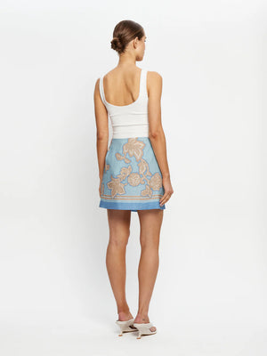 Coco is a soft botanical print featuring blush-toned florals set against a light blue base. The Coco Mini Skirt features a wrap-front silhouette with contrast ties and a bordered hem, offering a clean, modern finish. Designed for ease and movement, it’s a versatile piece for warm-weather wardrobes. Style with the matching Coco Cropped Shirt for a coordinated look, or pair with a simple tank and sandals for relaxed weekend dressing.