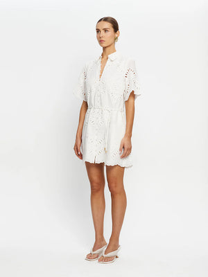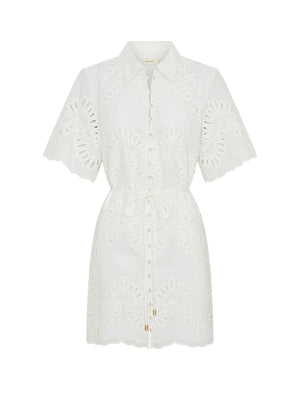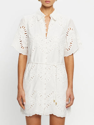 The Danielle Mini Shirt Dress is crafted from white cotton broderie in a relaxed shirt silhouette, featuring a button-through front and classic collar. Scalloped edging at the sleeves and hem adds a considered finish, while the removable waist tie allows you to adjust the shape with ease. Pair with slides for relaxed daytime dressing.