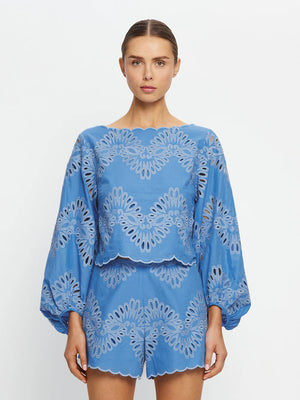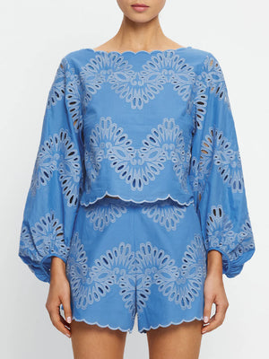 The Danielle Top is crafted from blue cotton broderie, featuring a wide boat neckline and long blouson sleeves, finished with a scalloped hem for a considered touch. Designed for light, effortless wear. Pair with the matching Danielle Mini Skirt for a coordinated look, or style with denim and sandals for easy daytime dressing.